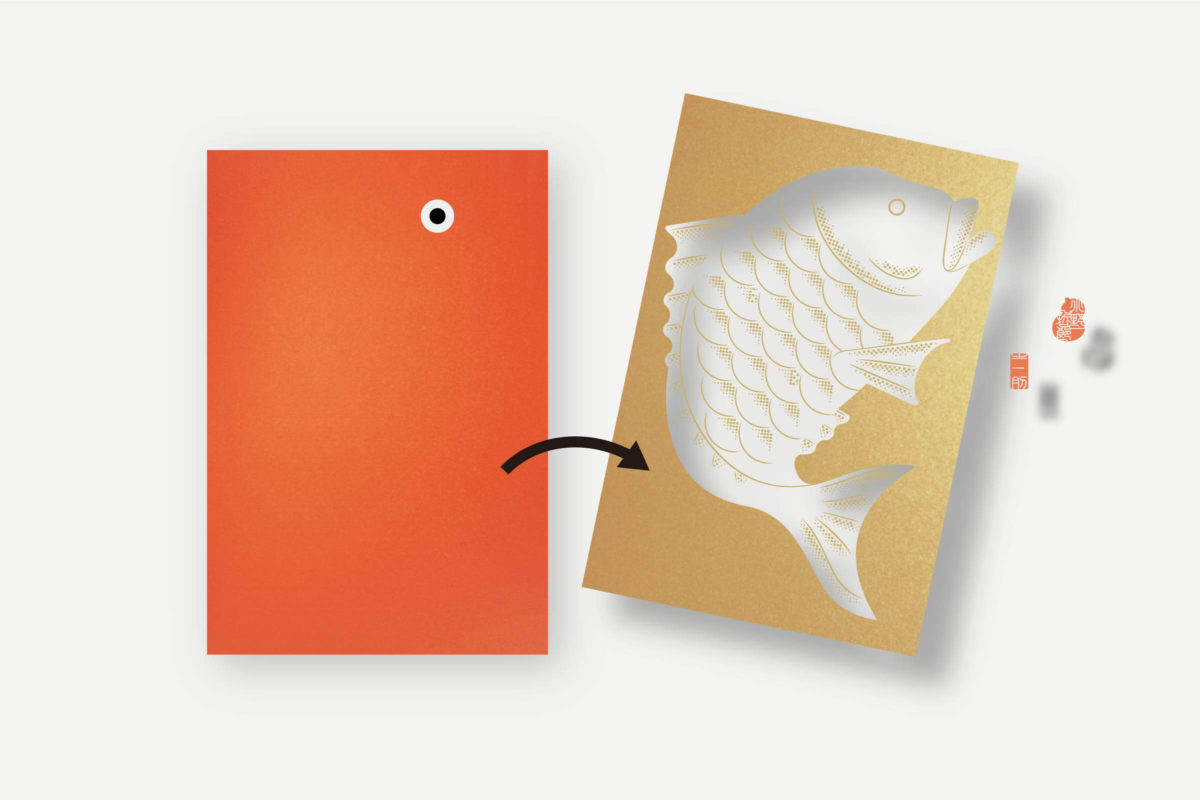 実はこの年賀状、金色のほうが紙じゃなく、鯛のバディになってる赤色の方が紙の色やねんな!!