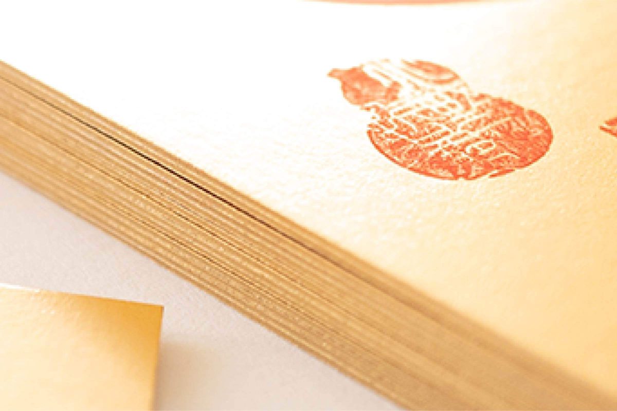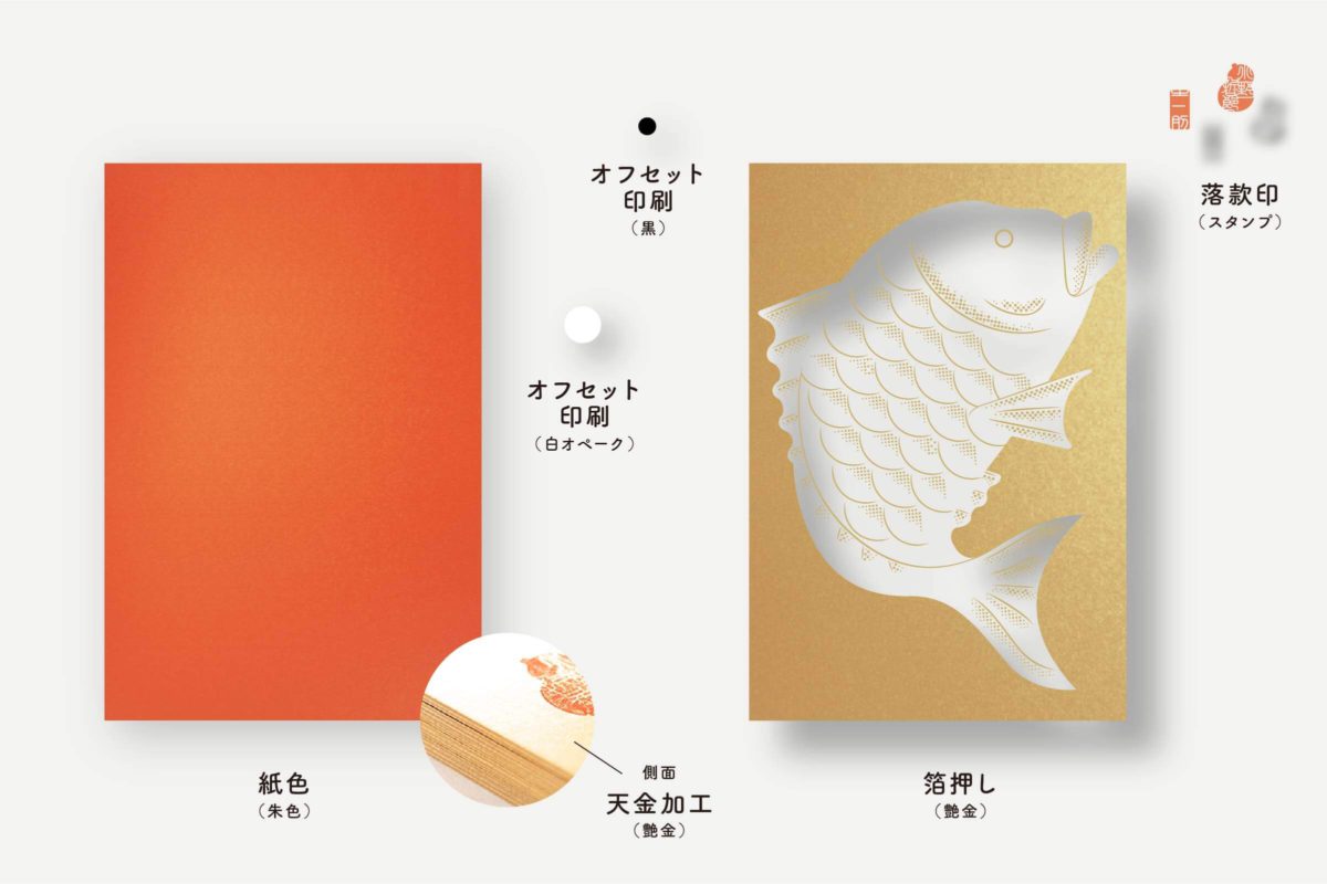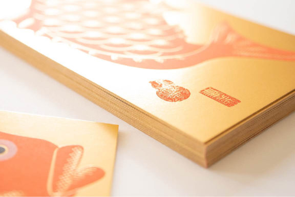 金色の紙に、赤色の印刷をしてるんかな?いや、でも…赤のインキって、透けずに金色の紙の上に乗るんかなぁ?