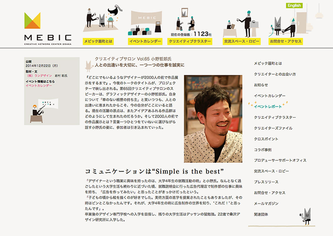 関西で活躍するさまざまなクリエイターが、これまでの活動を通して、仕事への向かい方や生き方などを語る少人数のコミュニケーションイベント、「Mebic扇町・クリエイティブサロン」に、小野が登壇しました。 当日は会場の
