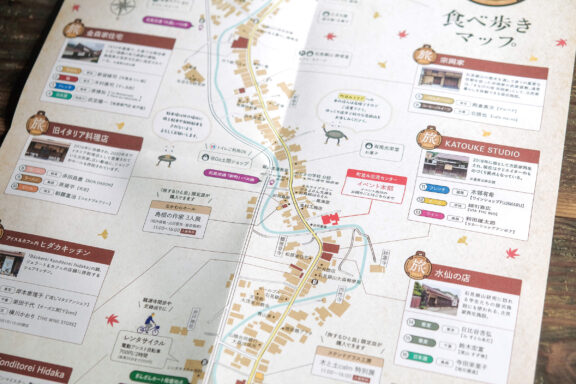 お皿に見立てた旅行鞄のロゴや、その鞄型に入る色とりどりの一品をメインビジュアルに、食べ歩きしながら大森町の情緒あふれる町並みを散策できる公式リーフレットなどを制作。
