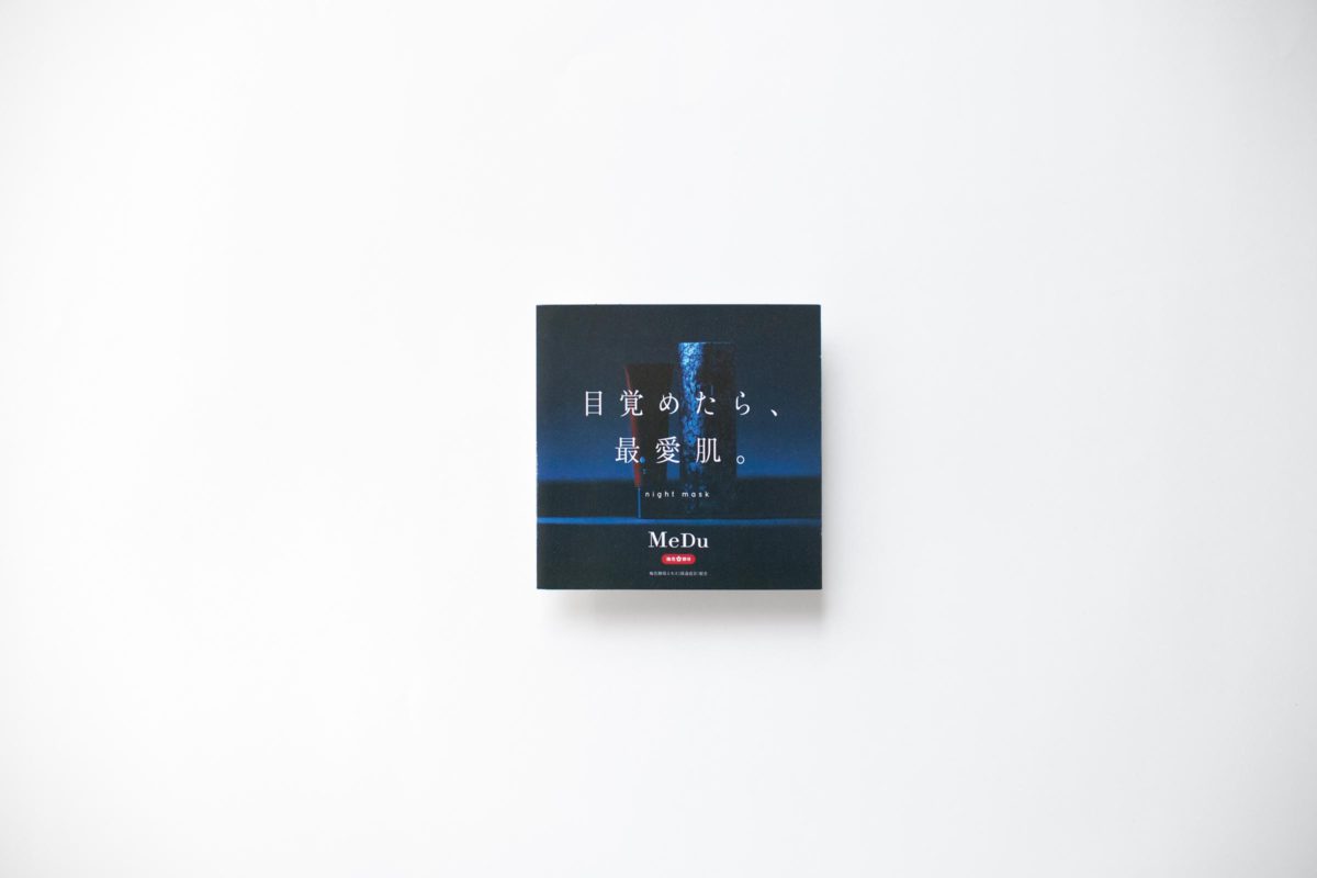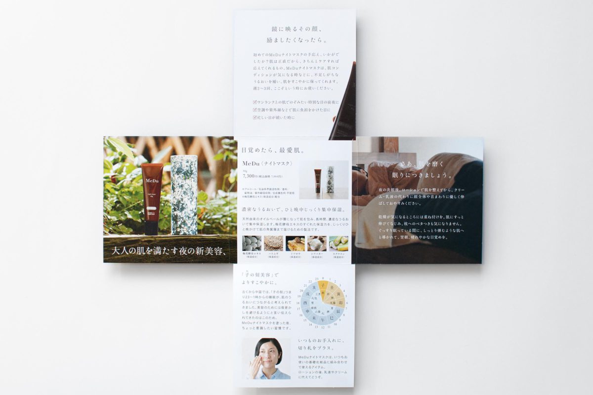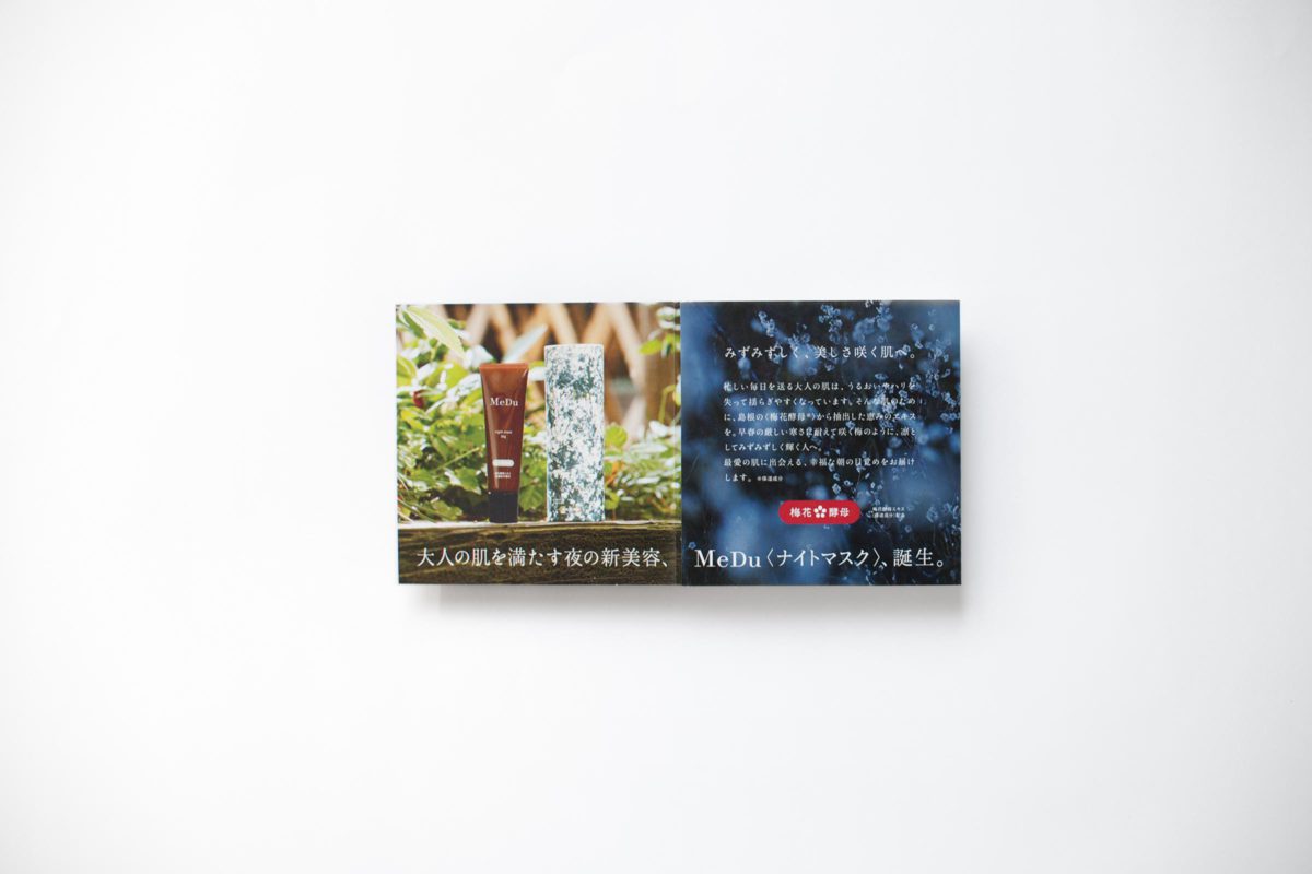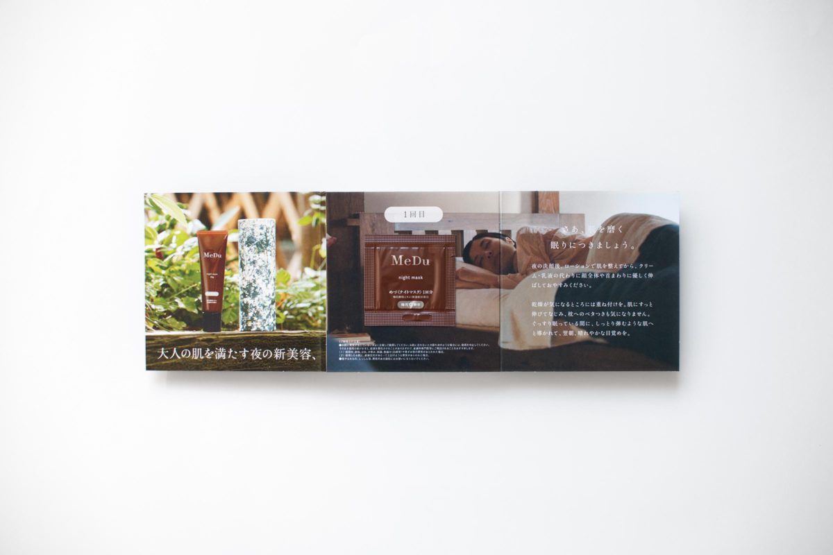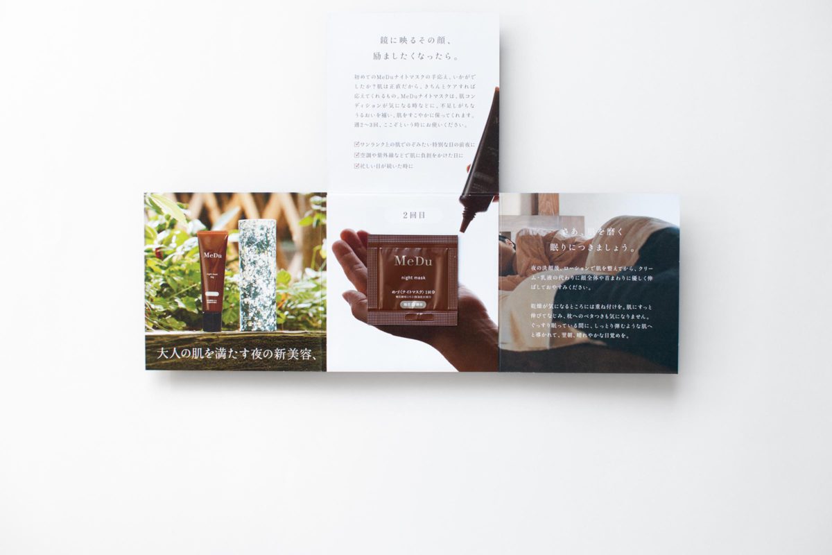 自然豊かな島根県石見銀山の梅の花から見つかった、「梅花酵母」を使用したスキンケア化粧品「MeDu」から登場の、ナイトマスクの試供品付きリーフレットを制作。