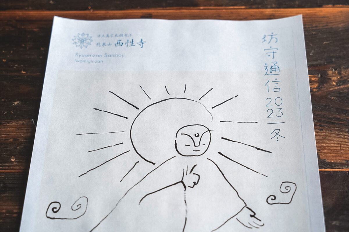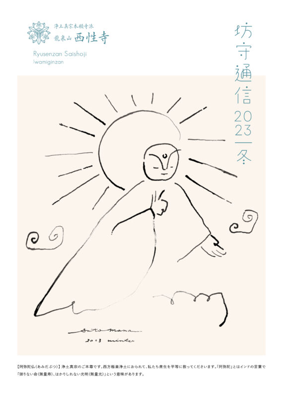 イラストレーションは、石見銀山のニワトリ飼いで知られる(?)佐藤愛さん。女性らしいやさしいタッチのご本尊・阿弥陀如来さまになりました。