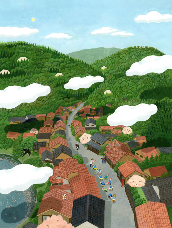 絵本作家としても活躍中のイラストレーター・くのまりさんに依頼し、江戸時代から続く石州瓦の立ち並ぶ町並み、そこにある空気感、園児の生き生きとした姿を描き下ろしてもらいました。